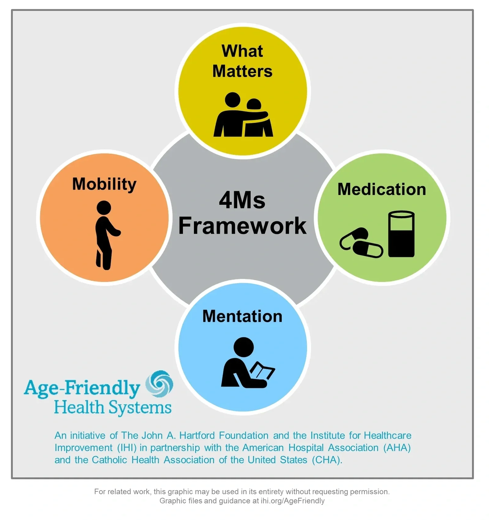 All work is guided by the Age-Friendly Health Systems framework and the 4Ms of care: